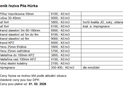 Naše pila se zabývá pořezem, výrobou a impregnací stavebního řeziva různých délek jakož to latě, prkna, hranoly, paletové přířezy, fošny, přířezy na výrobu příhradových vazníků. Produkcí dřevního odpadu jako je štěpka, piliny a výroba palivového dřeva. Výroba probíhá vždy na základě závazné objednávky, vystavení cenové nabídky oboustranně odsouhlasené a stanovení termínu dodání. Vyrábíme nejčastěji ze dřeviny Smrk, ale jsme schopni vyrobit řezivo i z jiných dřevin např. Douglaska, Borovice, Modřín, Dub.